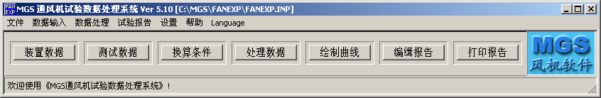 运行《MGS通风机试验数据处理系统》软件后,系统显示《MGS通风机试验数据处理系统》主菜单。