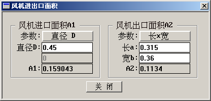 如果已知面积,双击数据区域,即可输入/修改数据。如果是以其它形式给出(长x宽、直径等),可使用风机面积计算功能计算。点击[数据输入->风机面积计算]后,显示[风机进出口面积计算]对话框。