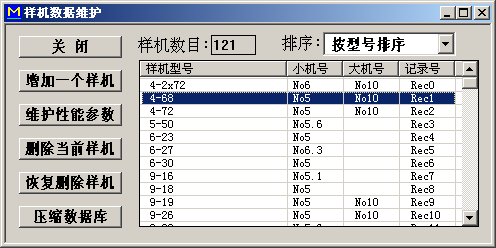 在主菜单中选择[样机数据维护]功能,点击下拉式菜单维护,点击样机数据维护条目,就进入[样机数据维护]功能,屏幕显示[样机数据维护]对话框。
