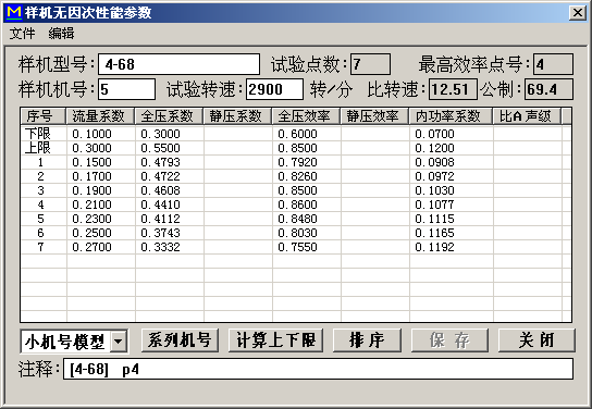 双击对应数据条目,可输入或修改样机的性能参数:[流量系数]、[全压系数]、[静压系数]、[全压效率]、[静压效率]、[内功率系数]、[比A声级]、[样机型号]、[样机机号]、[试验转速]等。