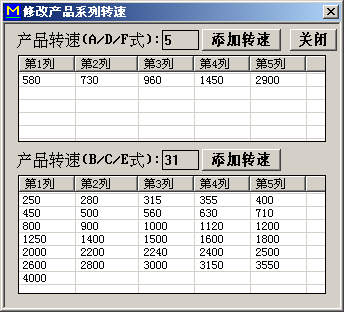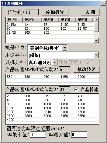 条目:该条目可添加该风机的系列转速。不同的传动方式添加相应的转速添加完点击关闭。再在[系列机号]对话框内选择[产品转速]。