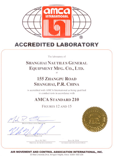 在上海诺第乐公司于2011年通过美国AMCA的试验室认证。