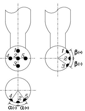 在探针头部上有五个孔,中间孔用来测量来流气流总压,其余四个测孔可以作为方向孔,也可以用来测量静压;探针上有一水平块,在校准和测量时确定探针水平位置。